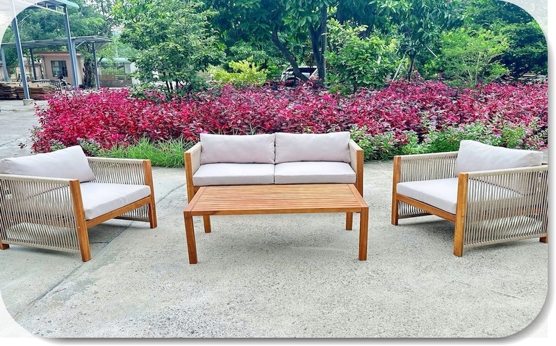 The Amici is a stylish outdoor hosting lounge, fully made of high quality Acacia Hardwood*, padded with comfortable weather resisting seats and backrests, and finished with stylish woven-rope armrests